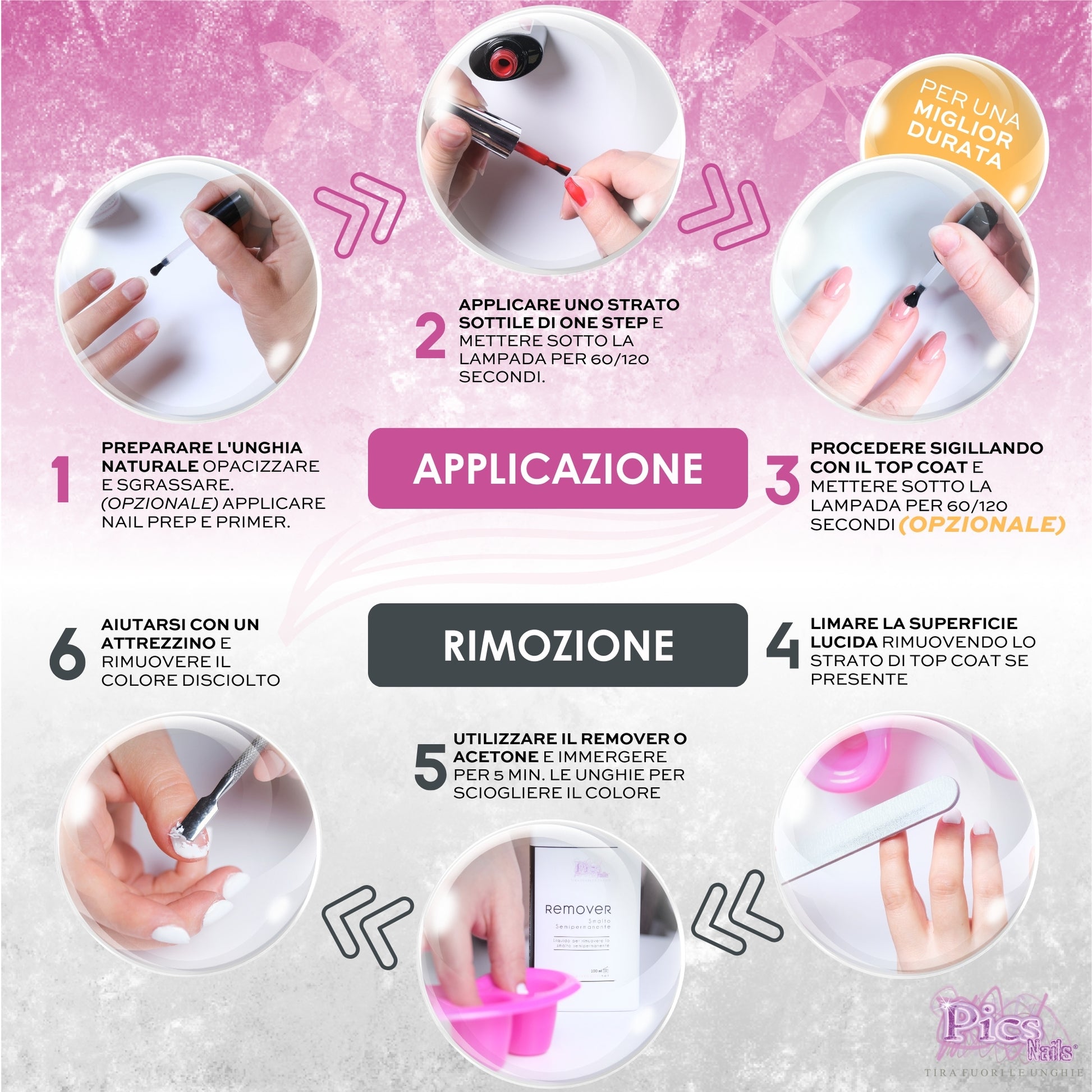 🔝 SMALTO ONE STEP UNIVERSALE : In french o su unghia intera, i Colori Semipermanenti Pics Nails possono essere utilizzati con tutte le marche di basi, gel, acrilici e top e con, o senza Base & Top garantendo Brillantezza e Tenuta Uniche per Settimane.