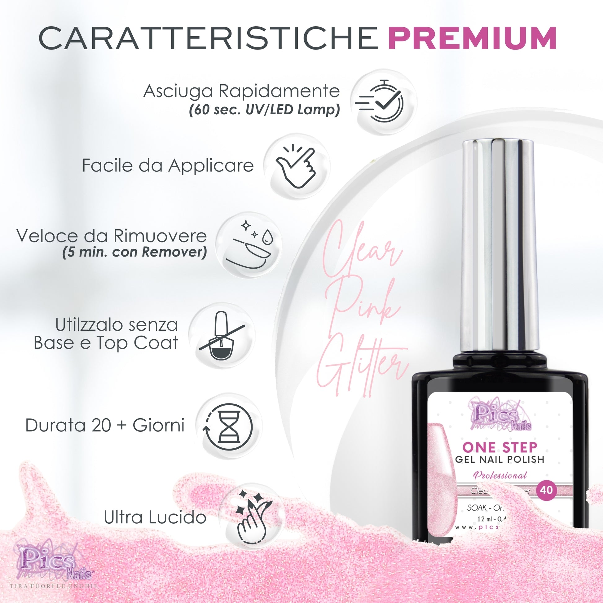 Smalto Semipermanente One Clear Pink Glitter 40 - 12 ml | Semipermanente 3in1 UV/LED Ultra Lucido