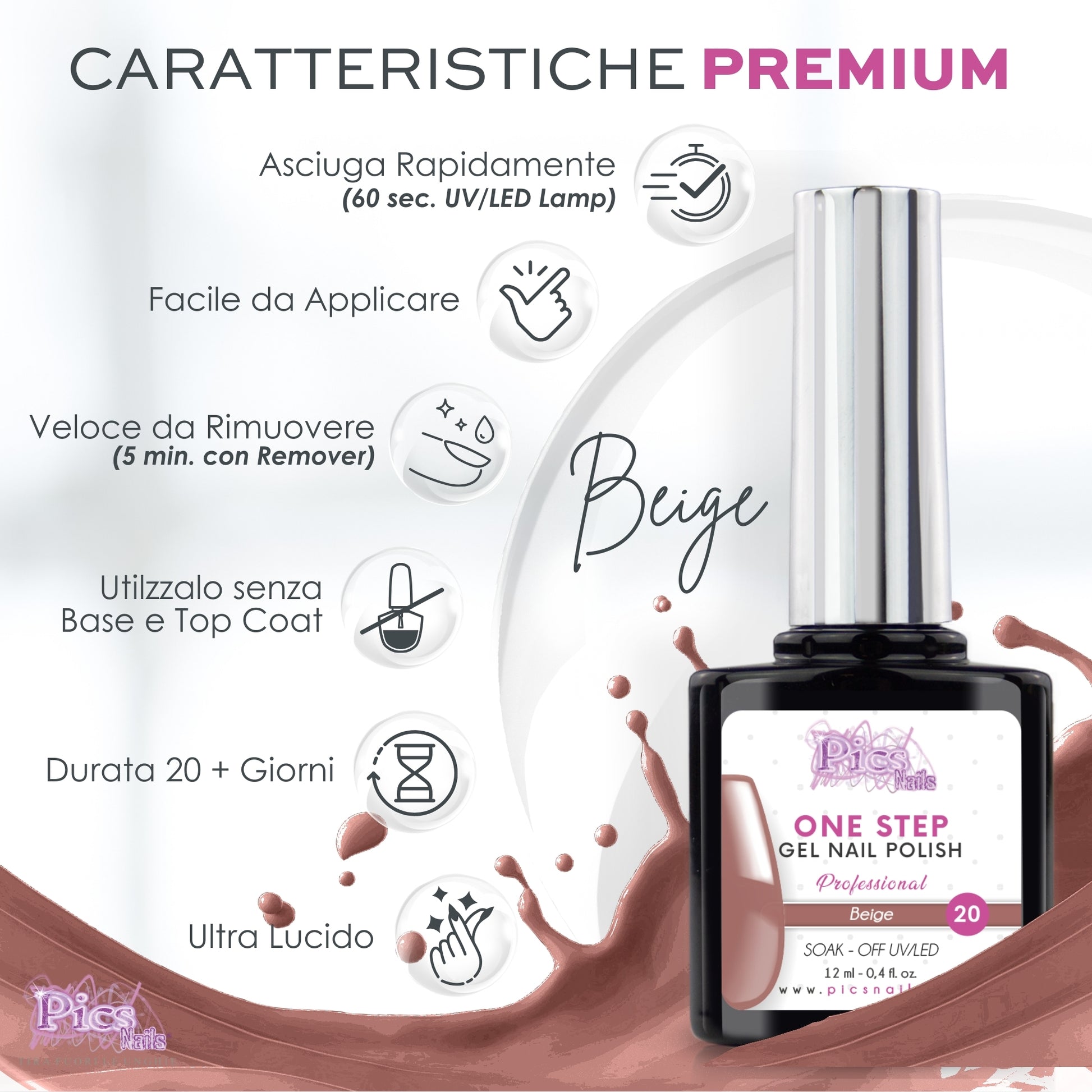 🔝 SMALTO ONE STEP UNIVERSALE : In french o su unghia intera, i Colori Semipermanenti Pics Nails possono essere utilizzati con tutte le marche di basi, gel, acrilici e top e con, o senza Base & Top garantendo Brillantezza e Tenuta Uniche per Settimane.
