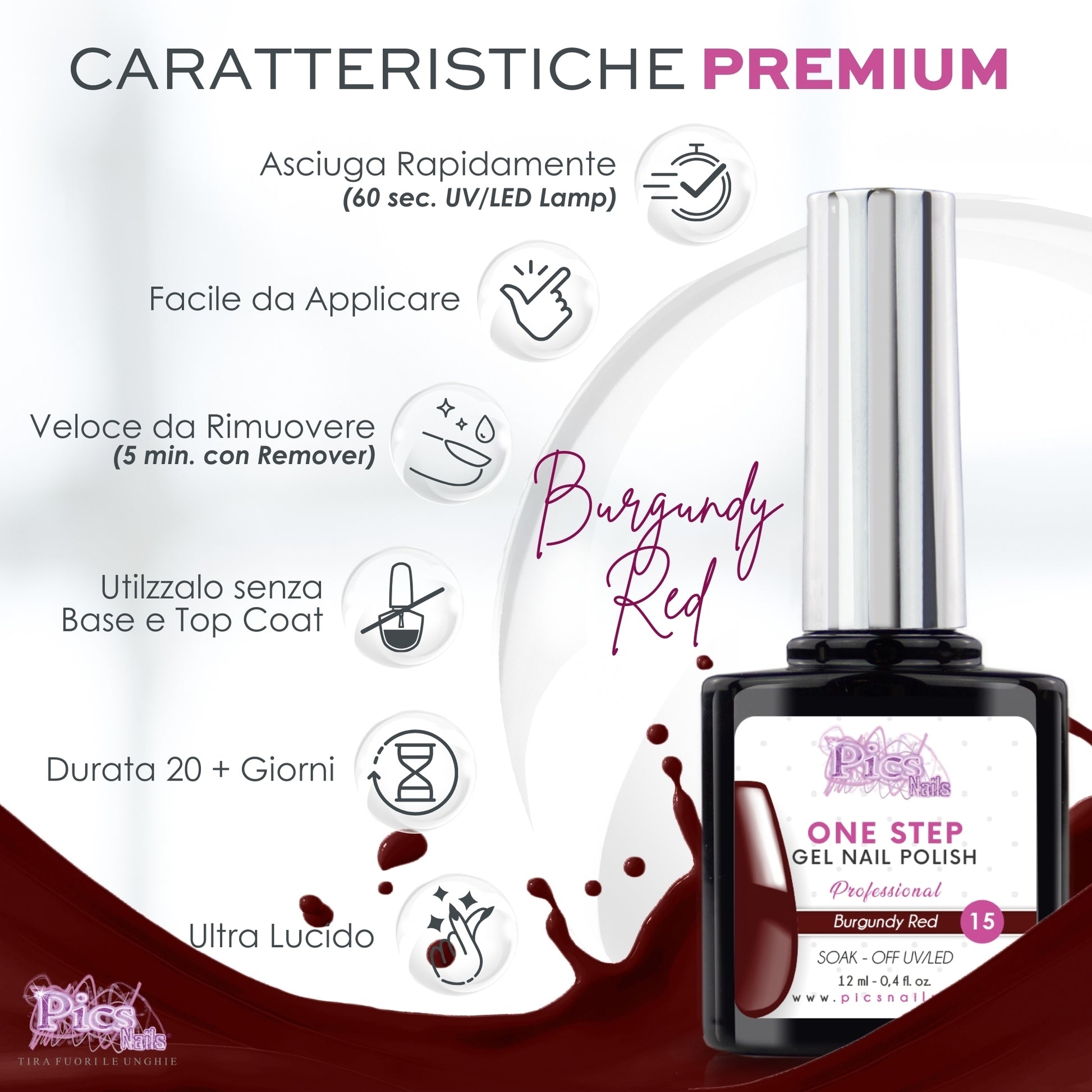 Smalto Semipermanente One Step Burgundy Red 15 - 12 ml | Semipermanente 3in1 UV/LED Ultra Lucido