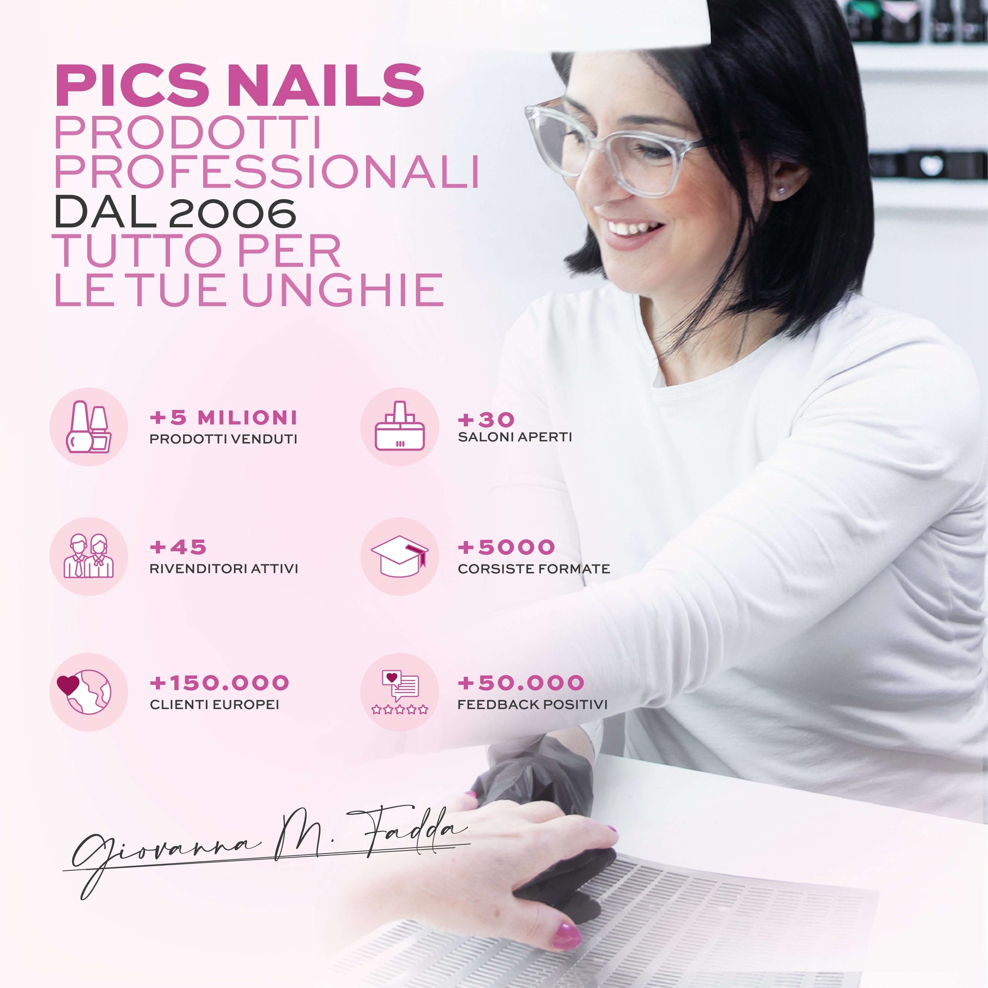 Tutti i Prodotti Cosmetici per Unghie Pics Nails vengono scelti e Selezionati da un Team di Tecniche ed Estetiste Esperte Diretto dalla Master Insegnate Onicotecnica Professionale, Giovanna Mary Fadda che vanta una ventennale esperienza nel settore Nails, Estetico e Cosmetico; Tutti gli articoli presenti sono utilizzati giornalmente da migliaia di Professioniste Onicotecniche ed Appassionate in Tutta Europa e nel Mondo.