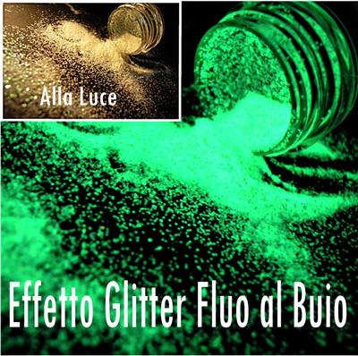 la superficie e dopodichè passare più volte il top coat per rendere liscia e resistente la superficie; NELLA RICOSTRUZIONE UNGHIE: - Stendere un sottile strato di Gel Costruttore e spolverare, nelle aree interessate, la quantità di polvere desiderata e poi esporre il tutto ai raggi in lampada Uv; Procedere poi, con la normale applicazione del Gel Costruttore. OPPURE - Miscelare a piacimento la polvere brillantinata al Gel Uv Costruttore provvedendo a versare in piccole dosi la Polvere fino all'ottenimento dell'effetto desiderato. Per garantire una buona aderenza deve sempre rimanere al di sotto del 10 % rispetto al Gel utilizzato. Utilizzare per questa procedura l'apposito Bicchierino in Vetro, o il bicchierino doppio contappo o la tavolozza per Nail Art; RICOSTRUZIONE UNGHIE CON ACRILICO: - E' possibile eseguire la stessa procedura vista sopra per il gel andando a miscelare La polvere glitter fluorescente direttamente con le polveri acriliche prima dell'inzio della lavorazione; CONFEZIONE: Barattolo da 3 Gr di prodotto. Peso: 10 Gr Potete vedere dei LAVORI ESEGUITI con questo prodotto andando nella nostra FotoGallery cliccando qui: Unghie Fluorescenti