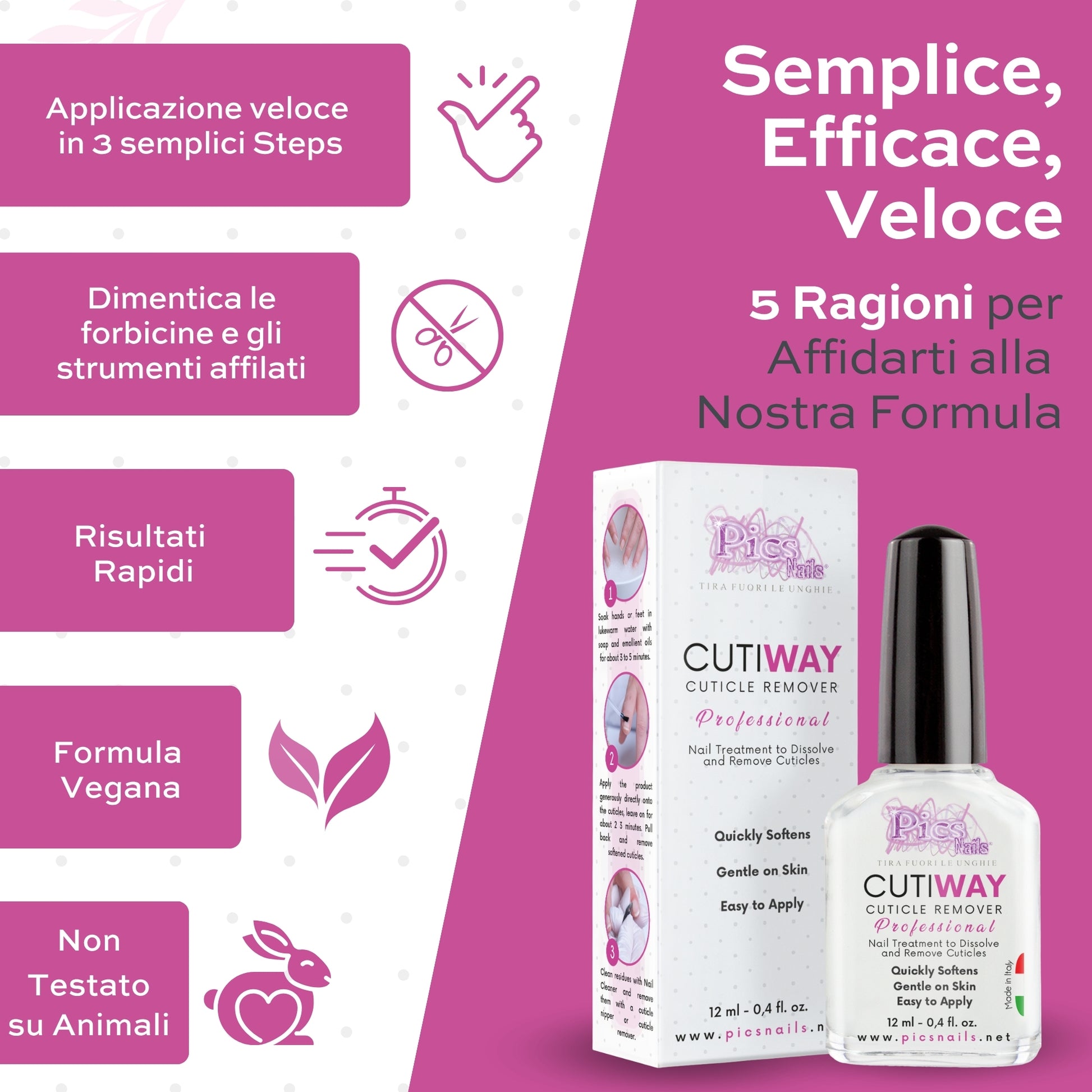 Cutiway Rimuovi le Cuticole di Mani e Piedi con un Trattamento specifico dalla colorazione lattiginosa e dalla media viscosità, da utilizzare per l'eliminazione delle cuticole in eccesso presenti sulla lamina ungueale. La sua specifica formulazione scioglie le pelli ammorbidendole per facilitarne l'asportazione. Da utilizzare durante le procedure di manicure e di pedicure. Applicare il prodotto direttamente sulle cuticole dopo aver rimosso l'eventuale smalto presente, ed aiutandosi con un bastoncino d'arancio o con uno spingi cuticole, effettuare dei movimenti circolari in modo da spingere indietro le cuticole rimuovendole facilmente; Eliminare i residui con un tonico addolcente o con dell'acqua calda. Formato: Boccetta con Pennellino da 12 ml.