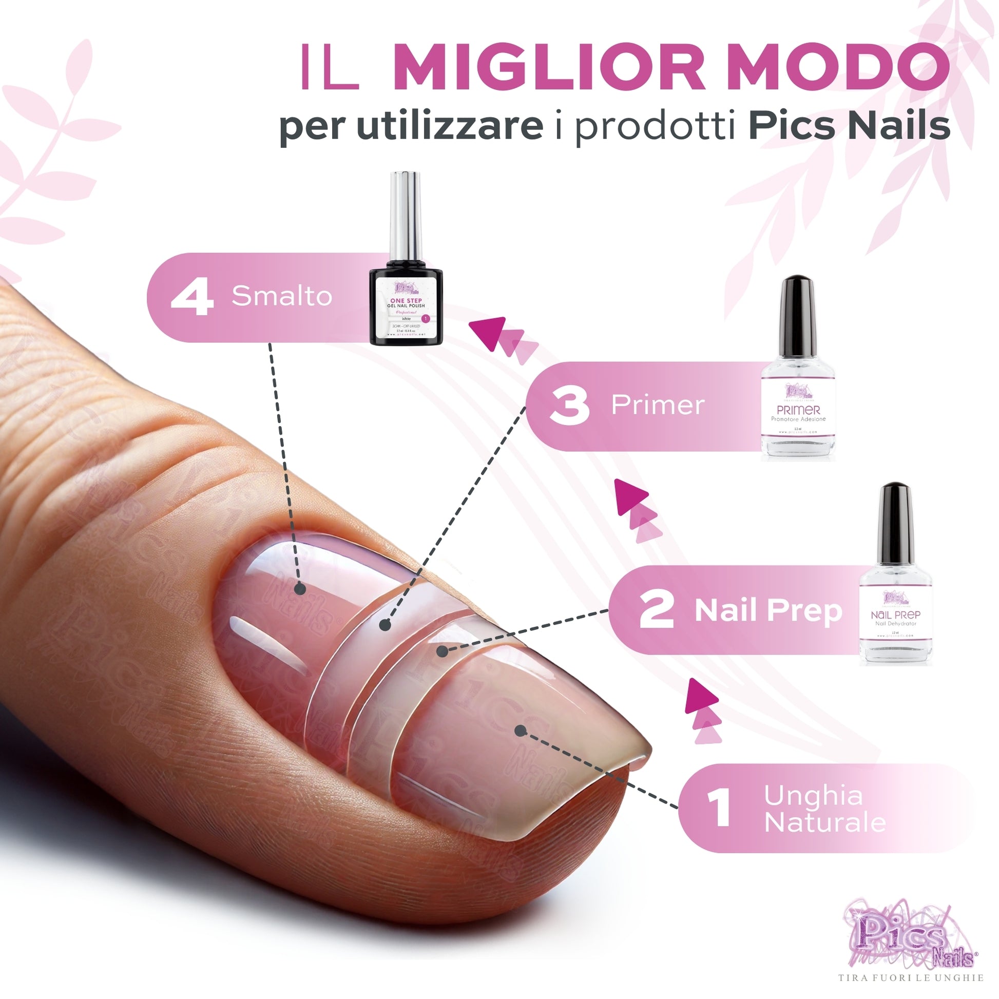 - APPLICAZIONE RAPIDA: Semplice e Veloce e ideale per una corretta Fase di Ricostruzione Unghie. Igienizzare l'unghia, deidratare con Nail Prep, Applicare il Primer Promotore d'adesione, Applicare una Base/ Gel builder, Sgrassare con Cleaner, Applicare il Colore
